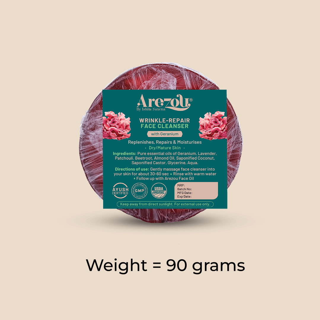 Arezou Therapeutic Aromatherapy Inspired Wrinkle Repair Face Cleanser is personally crafted by our founder Ishita Saxena to help women embrace their skin’s journey through different life stages. Whether navigating the hormonal landscape of perimenopause, experiencing the transformative phase of menopause, or addressing the natural aging process, our ritual is designed to reduce the appearance of fine lines and wrinkles while providing a nourishing and indulgent experience. Harnessing the power of geranium essential oil, renowned for its sweet, floral scent and rejuvenating properties, our wrinkle repair serum is a potent solution that improves mood and promotes skin vitality through every chapter of a woman’s life.